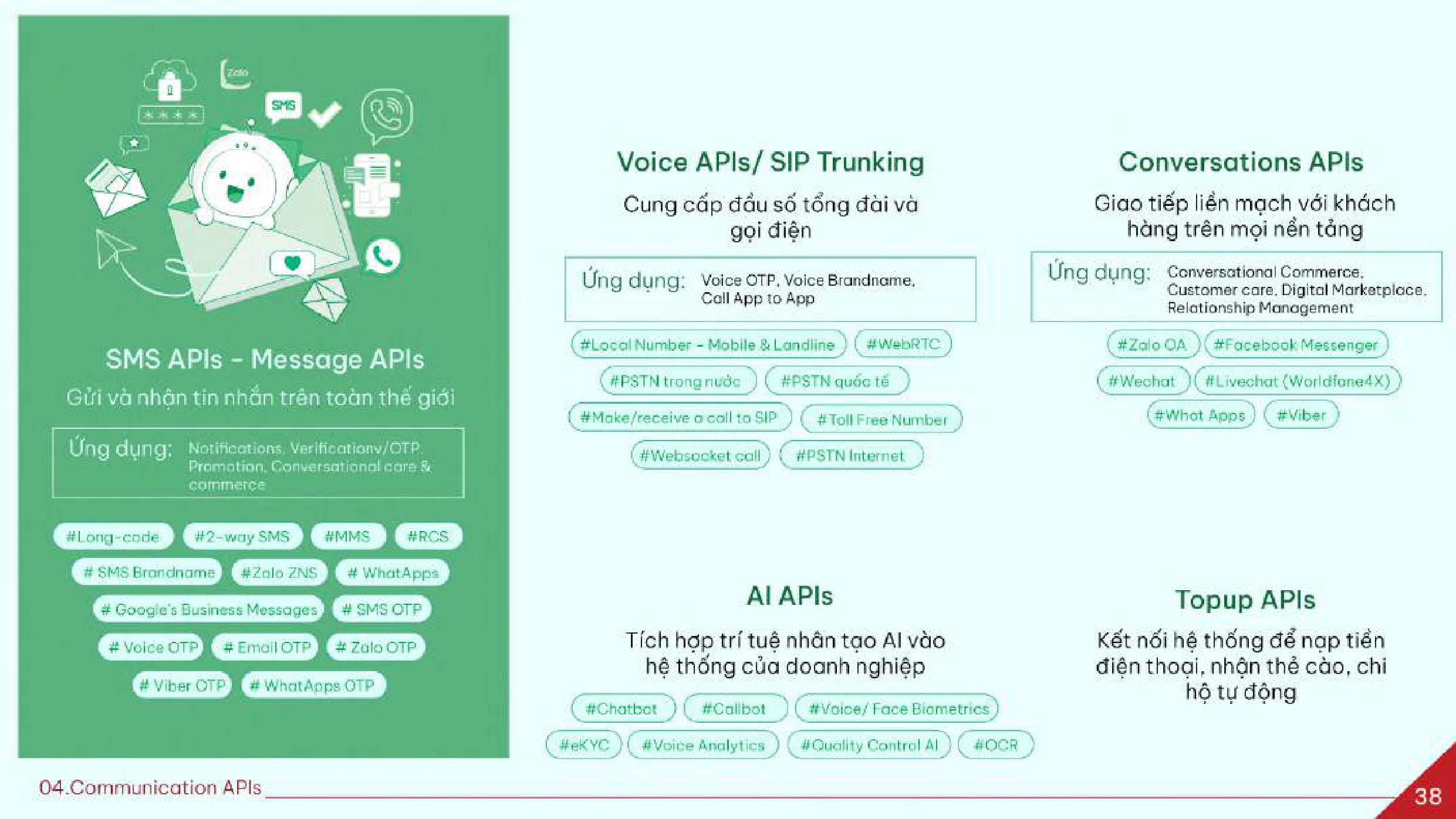 - Cam kết SLA: Thời gian gửi tin <5 giây/tin, độ sẵn sàng hệ thống 99,99%, tỉ lệ rớt tin <0,05%