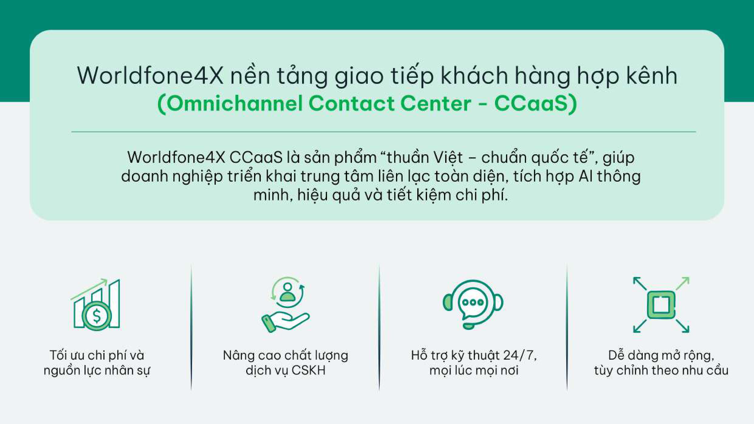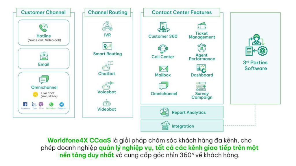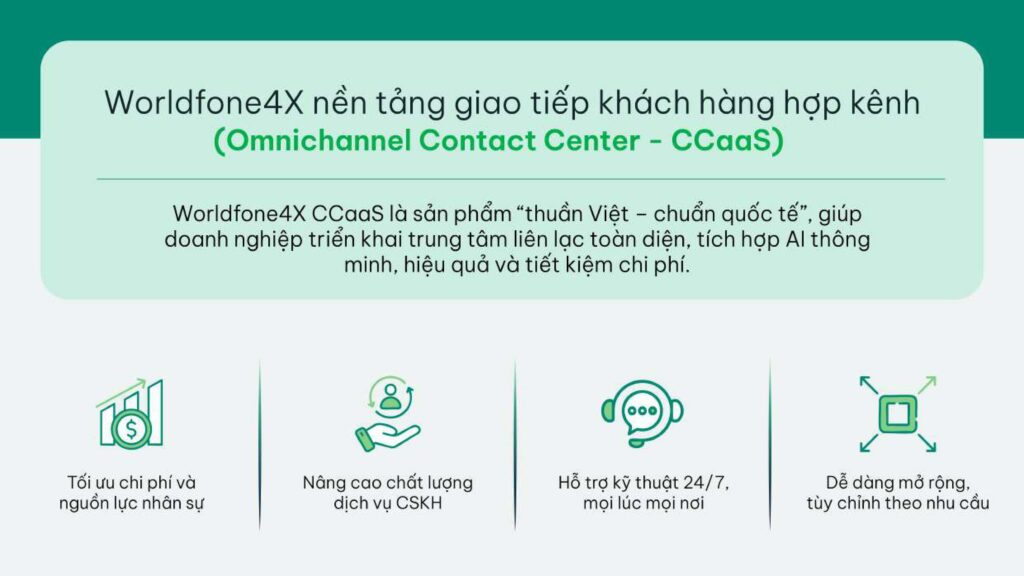 Worldfone4X (Omnichannel Contact Center – CCaaS) là nền tảng giao tiếp/ chăm sóc khách hàng hợp kênh tích hợp AI thông minh cho phép doanh nghiệp quản lý nghiệp vụ, tất cả các kênh giao tiếp trên một nền tảng duy nhất và cung cấp góc nhìn 360° về khách hàng. Hình thức triển khai hệ thống Worldfone4X CCaaS: Triển khai trên hệ thống khách hàng (On-Premises), triển khai trên hệ thống đám mây của Worldfone (Cloud) hoặc triển khai linh hoạt kết hợp giữa On-Premise và Cloud (Hybrid).