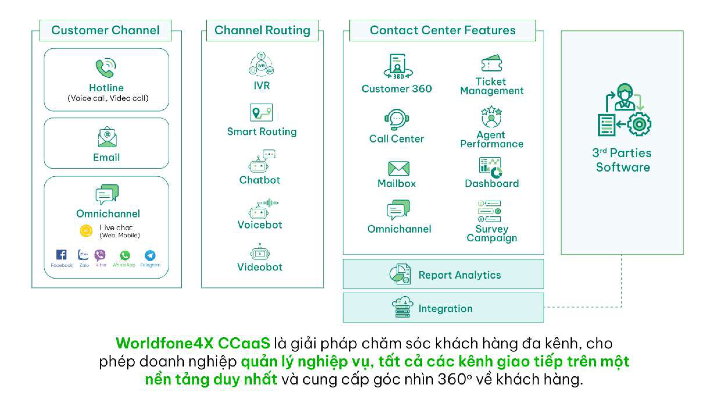 – Omnichannel Chat (Facebook Messenger, Zalo, Viber, Telegram, Live Chat,….).