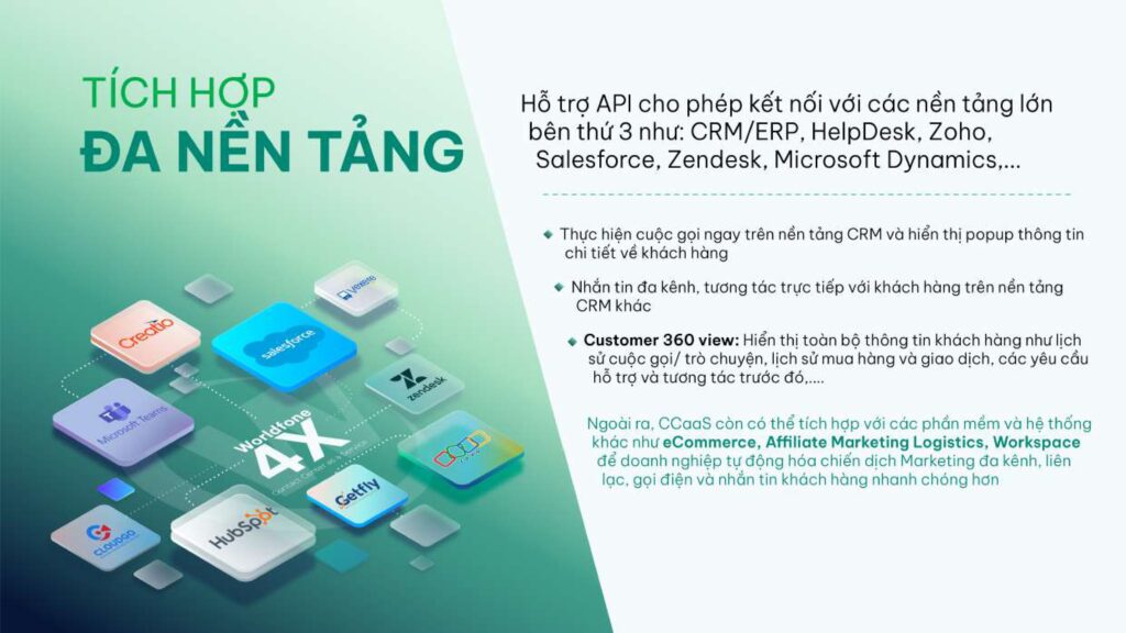 - Tích hợp API mở, dễ dàng kết nối với các nền tảng CRM/ ERP, HelpDesk như Zoho, Salesforce, Zendesk, Microsoft Dynamics,...